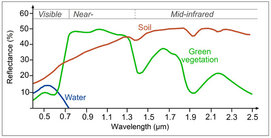 Spectral reflectance characteristics of soil, green vegetation, and water across the electromagnetic spectrum [36].
