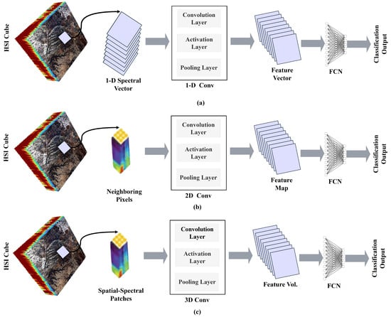 For instance, 1D-CNNs focus on extracting temporal or spectral features from single pixels without accounting for spatial inter-pixel relationships or contextual information [76]. In contrast, two-dimensional 2D-CNNs typically segment large input images into smaller patches, with each label corresponding to the central pixel of the patch [66]. However, 3D-CNNs provide a more comprehensive approach by simultaneously learning from both spatial and spectral dimensions, making them particularly suitable for hyperspectral data [79].