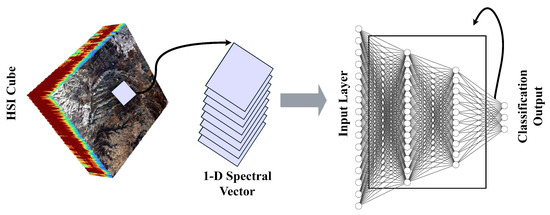 On the other hand, Recurrent Neural Networks (RNNs) have gained prominence as dynamic and adaptable tools for HSI, offering unique capabilities for analyzing the spectral dimension of hyperspectral data cubes [25]. Their loop-based architecture (Figure 9) allows them to retain contextual information from previous inputs, making them well suited for analyzing spectral signatures [82].