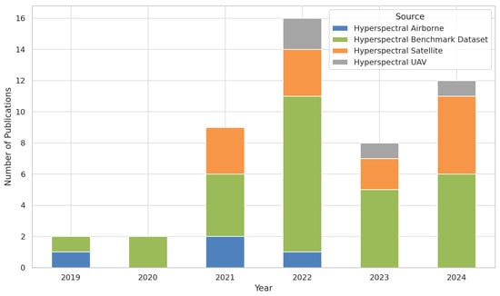 Inclusion and exclusion criteria are essential for ensuring the relevance of selected studies to our research topic. The primary focus was on studies written in English and published in peer-reviewed journals and conference proceedings between 2019 and 2024. This time-frame was selected because 2019 marked the launch of the new era of hyperspectral satellites, such as DESIS and PRISMA, which offered open-access hyperspectral data. Moreover, this period saw significant advancements in AI algorithms for hyperspectral data processing, improving capabilities for tasks like classification, and benefiting from cloud and high-performance computing developments. However, it is important to mention that studies that did not align with our specific research focus were excluded. For instance, only studies that directly addressed crop mapping using HSI with advanced AI algorithms were included. Additionally, studies representing the same methodological approach were excluded. Due to their nature, survey articles were also excluded from the analysis. However, they were not entirely disregarded during the reading process. Their valuable insights enhanced the discussion points within our review.