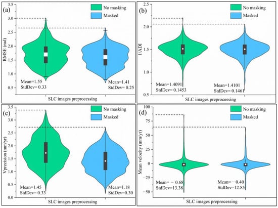 - 1/ADI: Higher 1/ADI values indicate better phase stability of the pixels and more reliable results. The masking process had minimal impact on the phase mean and standard deviation (1/ADI), with no significant difference observed before and after processing. This suggests that geometric distortions affect the magnitude of interferometric phase errors rather than the phase distribution itself. The result also indicates that reducing sources of phase error is crucial for improving InSAR monitoring quality.