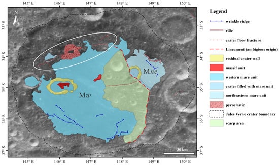 Using high-resolution imagery, terrain data, and remote sensing spectral analysis, we have classified the geological units on the floor of the Jules Verne impact crater. According to the mare position of the crater floor, two primary mare units have been identified: the west mare unit (Mw) and the northeast mare unit (Mne). Within these mare units, numerous structures resulting from magmatic activity, such as wrinkle ridges and rilles, were observed. Several east–west trending channels are located in the northern part of the Mw unit, and they mainly exhibit a concentric pattern, with a few displaying a radial pattern (the crater floor fracture located within the white elliptical outline). The floor of these channels is partially filled with basalt (Figure 1). These channels often have outer surfaces primarily composed of highland materials and are significantly older than the basalt that fills them. We propose that they are most likely crater floor fractures formed by magma intrusion (Figure 2). Additionally, pyroclastic deposits can be found near one crater floor fracture (Figure 2). In terms of spectral composition and albedo characteristics, these pyroclastics deposits (Figure 1) exhibit distinct geological features compared to mare units. They are relatively enriched in TiO2 and FeO compared to the mare basalts.
