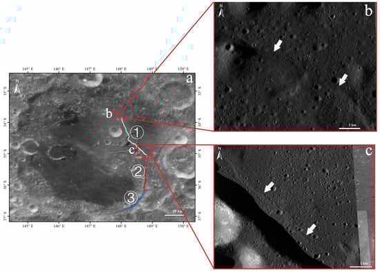 A distinct linear feature, parts of which were previously interpreted as the largest isolated lunar scarp [9], is observed in the southeastern region of the impact crater from Kaguya TC Mosaic. This structure originates in the northern part of the crater floor, extending in a northwest–southeast direction (Segment ① in Figure 3a). In NAC images, we observe that this segment is connected to a nearly east–west trending floor fracture to the north. The transition trace between the lineament and the floor fracture is not very well defined (Figure 3b). There is an elevation difference of approximately 20 m, and the slope parallel to the lineament is relatively gentle. The surface shows subtle signs of creep. Towards the end of this segment, a trace appears that runs nearly parallel to the slope face (Figure 3c). The elevation of this feature is about 10 m, and the surface exhibits more pronounced creep. As the feature reaches the boundary between basalt and crater wall collapse material, its orientation shifts to a north–south direction (Segment ②). Further extending towards the wall of the Jules Verne crater, the orientation changes again, aligning northeast–southwest and running nearly parallel to the remnants of the crater wall terraces (Segment ③). Segments ② and ③, situated within the highland unit, are identified as the largest isolated lobate scarp recorded in the Watters lobate scarp database.