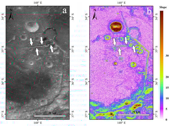 At segment ②, the scarp face displays a sharp contact with the neighboring geologic unit. The elevation difference between these two units is about ~350 m and the slope of this part of the scarp face is about 20~30° (Figure 4b), the back limb scarp shows a gentle slope of less than 10° (Figure 4b), and the contact between the back scarp and the western mare unit is not clear. Towards the south, the slope becomes gentle (about 15~20°) and the sharp contact becomes indistinct; the back scarp becomes much thinner, but also steeper. Once the scarp trace changes orientation from N–E to NE–SW, the vergence direction of the scarp is uphill to the southeast. On this part of the scarp, the contact relationship between the scarp face and the adjacent geological unit becomes sharp again, but the slope of the scarp face gradually lessens, and the scarp trace terminates at a location on the crater wall. The maximum relief of this part of the scarp is about ~150 m, with the slope of the scarp face in this section being approximately 20 to 30° (Figure 4b), which is generally similar to the scarps reported earlier regarding vergence direction, maximum relief, and the maximum slope on the scarp face [7,9,38].