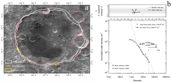 Unfortunately, due to the extensive modification of the Jules Verne crater by subsequent impact events, it is nearly impossible to identify clear and continuous ejecta deposits, and the crater floor has been filled with later basaltic flows. Therefore, we selected the crater rim as the dating area for this study, applying the buffered crater counting technique (Figure 6a). The crater rim preserves a substantial number of superposed impact craters, making it a suitable surface for age determination. In theory, any region that was unambiguously resurfaced at the time of crater formation may be selected. For very old craters, the rim is more reliably identifiable than any ejecta blanket and, provided the crater is sufficiently large, it contains a sufficient number of superposed impact craters to support reliable age estimates. The CSFD measurements of Jules Verne crater reveal an AMA of 4.21 Ga, based on the superposing impact craters with diameters ranging from 3.8 km to 35 km (Figure 6b).