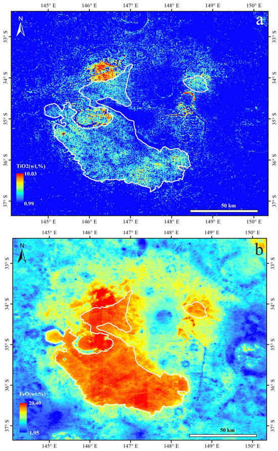 TiO2 data were derived from the Lunar Reconnaissance Orbiter Wide Angle Camera Ultraviolet/Visible (LRO WAC UV/VIS) reflectance, with a spatial resolution of approximately 400 m/pixel [24]. The FeO, Al2O3, and CaO abundance data were sourced from the Kaguya Multiband Imager (MI) dataset, which provides a higher spatial resolution of about 60 m/pixel [25,26,27].