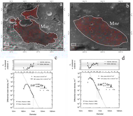 CSFD analysis indicates that the Mw has an AMA of 2.67 Ga, derived from impact craters with diameters between 290 m and 1.3 km (Figure 8c). Similarly, the Mne shows an AMA of 2.86 Ga, based on craters with diameters ranging from 150 m to 1.7 km (Figure 8d).