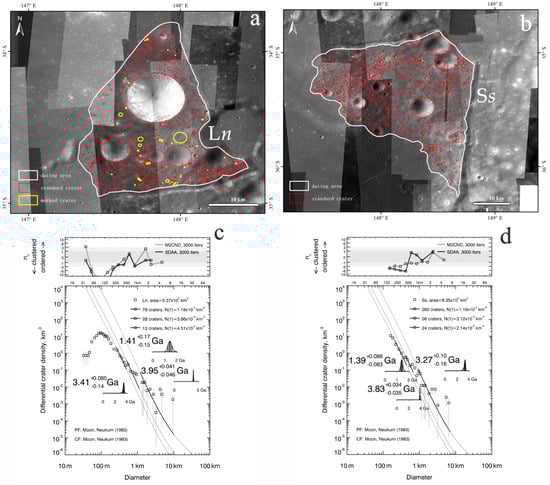 (a) Count area and measured craters of the Ln unit on NAC image mosaic with illumina-tion from west to east and incidence angle ranging from 0° to 80°; (b) count area and measured craters of the Ss unit on NAC image mosaic with illumination from west to east and incidence angle ranging from 0° to 80°; AMAs derived for the (c) Ln and (d) Ss units.