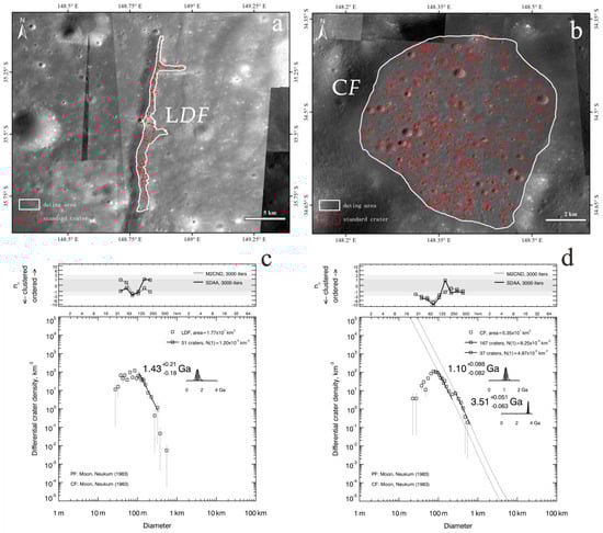 (a) Count area and measured craters of the LDF unit on NAC image mosaic with illumination from west to east and incidence angle ranging from 55° to 80°; (b) count area and measured craters of the CF unit on NAC image mosaic with illumination from west to east and incidence angle ranging from 0° to 80°; AMAs derived for the (c) LDF and (d) CF units.