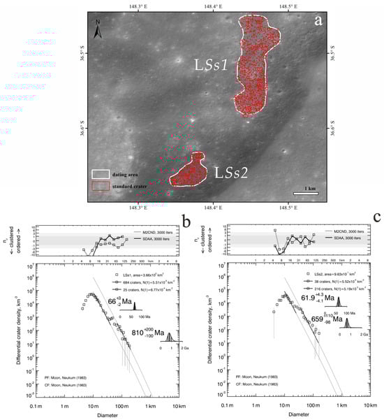 (a) Count area and measured craters of LSs1 and LSs2 on Kaguya TC Mosaic; AMAs derived for the (b) LSs1 and (c) LSs2 areas.