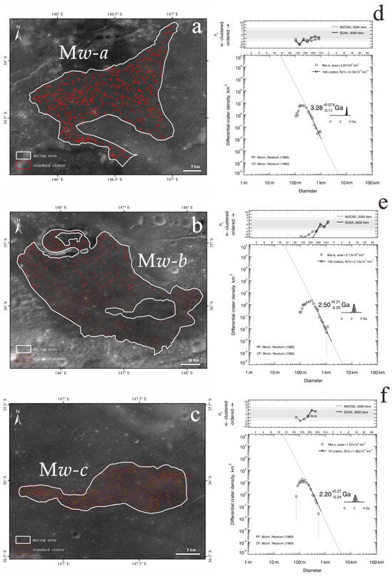 (a) Count area and measured craters of Mw-a unit on Kaguya TC Mosaic; (b) count area and measured craters of Mw-b unit on Kaguya TC Mosaic; (c) count area and measured craters of Mw-c unit on Kaguya TC Mosaic; AMAs derived for the (d) Mw-a, (e) Mw-b, and (f) Mw-c units.