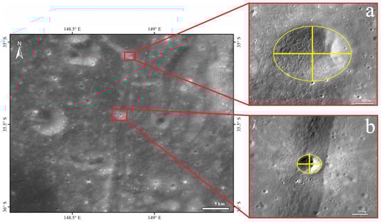 The location of the deformation crater. (a) Crater with a diameter of about 700 m located in the connection of segment ① and segment ② on NAC image mosaic with illumination from west to east and incidence angle ranging from 55° to 80°; (b) crater with a diameter of 567 m on the slope face of segment ② on NAC image mosaic with illumination from west to east and incidence angle ranging from 55° to 80°.