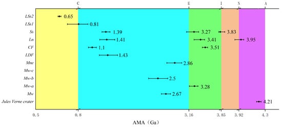 Previous studies have shown that there are two lunar mare units within the Jules Verne crater. Yingst and Head [39] classified the mare basalt deposits on the floor of the Jules Verne crater into two distinct flows: a northeastern flow and a western flow. They identified the northeastern flow as being older but did not provide an AMA for it. Haruyama et al. [40] determined an AMA of 3.34 Ga for the mare basalts within the Jules Verne crater. Unlike Yingst and Head [39], they did not differentiate the mare basalts into two mare units. Pasckert et al. [41] identified eight lunar mare units within and around the Jules Verne crater, and they proposed that the Mne unit has an age of 3.38 Ga, while the Mw unit dates to 3.22 Ga.