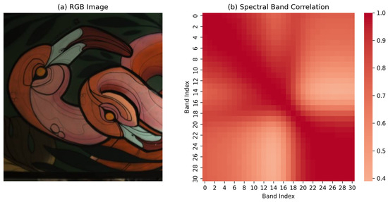 Visualization of spectral correlations in a hyperspectral image (Scene 0901 from ARAD_1K dataset). (a) RGB image. (b) Correlation matrix of spectral bands.