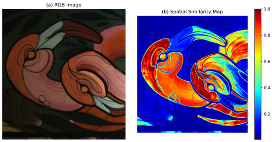 Visualization of spatial correlations in a hyperspectral image (Scene 0901 from ARAD_1K dataset). (a) RGB image. (b) Spatial similarity map for a selected point (marked in red in (a)).