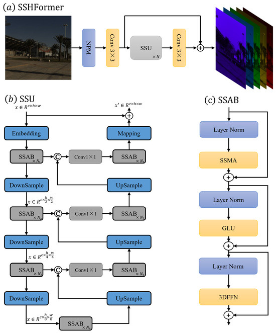 As shown in Figure 3a, the complete SSHFormer architecture consists of an initial NPM for noise reduction, two 3 × 3 convolution layers for feature extraction, N cascaded SSUs for progressive reconstruction, and global residual connections to facilitate gradient flow during training.