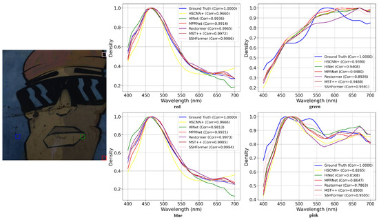 The results demonstrate SSHFormer’s exceptional performance in spectral reconstruction across all examined regions. Our method exhibits remarkable consistency in accurately reproducing the ground truth spectral signatures, surpassing the capabilities of existing approaches. While conventional methods like HSCNN+ and HINet show notable inconsistencies, particularly in higher wavelength ranges, SSHFormer maintains exceptional stability throughout the entire spectral range. This advantage becomes particularly evident in the bottom-right spectral plot, which represents a challenging region where competing methods show significant deviations from the ground truth. Furthermore, SSHFormer demonstrates remarkable adaptability across varying surface characteristics, successfully preserving intricate spectral details while maintaining reconstruction reliability. These comprehensive results clearly establish SSHFormer’s superior capability in minimizing spectral distortions and maintaining consistency across diverse scene elements.