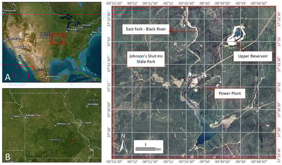 Between 1960 and 1963, the Taum Sauk pumped-storage hydroelectric plant, located on Proffit Mountain in southeast Missouri (Figure 1), was constructed to generate electricity by the overnight pumping of water from a lower reservoir, formed by damming the East Fork of the Black River, into an upper reservoir on the mountain top, and then releasing this water back into the lower reservoir to generate electricity during peak power periods [,]. The upper reservoir was constructed without a spillway, making monitoring of water level imperative []. While a large quantity of water was observed overtopping the northwest portion of the upper reservoir on 25 September 2005 [,], repairs of loose sensors at the bottom of the upper reservoir were postponed pending other scheduled maintenance to avoid additional shutdowns of the plant []. Unfortunately, at 5 AM on 14 December 2005, the high-water level sensors and backup probes failed to shut down the pumps feeding water from the lower reservoir into the upper reservoir, resulting in a catastrophic dam failure, with approximately 5,000,000 m3 of water released from the upper reservoir in just 12 min [,]. Peak flood flows were reported at volumes of 8184 m3/s, which had sufficient force to essentially remove all life forms and create a soil scour that extended approximately 2.6 km downhill of the dam (Figure 2), with flows extending through Johnson’s Shut-Ins State Park and into the East Fork of the Black River (Figure 1).