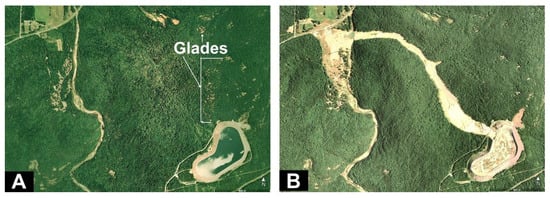 Many of the plants and animals found in the scour were found on the rhyolitic glades and seeps on the ridge above the scour (Table 3), and the proportion of species found on the scour that were species from glades and their seeps tended to increase with time (Table 3). This pattern indicates that the glades and seeps on the ridges above the scour were essential for the initial biological recovery of the scour. While glades and acidic seeps, seen as tiny light-colored dots in the extensive green forested areas (Figure 3A and Figure 9), represented only a tiny fraction of the pre-flooded landscape, they played a dominant role in the restoration of life into the scour (Table 3), an observation that supports the hypothesis that landscapes with high levels of habitat and species diversity are more resilient to perturbations than less diverse landscapes [,]. Therefore, in this case, habitat restoration was less about species diversity per se and rather about habitat diversity within a landscape, with even rare habitats playing a disproportionate role in restoration (Table 3).