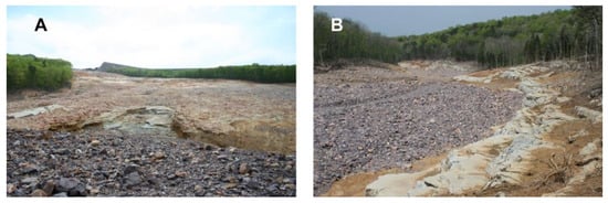 The water from the reservoir breach transported large boulders, sand, clay, uprooted trees, and pieces from the upper reservoir (Figure S1) down the western side of Proffit mountain, and into the campgrounds of Johnson’s Shut-Ins State Park (Figure 3). The water’s path from the upper reservoir to the East Fork of the Black River stripped vegetation and created a scour trail that was 6 m deep, 240 m wide (maximum), and 2.6 km long [,]. The lower reservoir absorbed the flood without the lower reservoir dam breaching, but it was left contaminated with natural sediment [].
