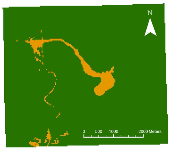 Example of reclassified binary NDVI output that represents areas with no vegetation or water (orange; NDVI ≤ 0.2) and areas with vegetation (green; NDVI > 0.2). See Supplementary File for outputs from all 20 years (2005–2024).