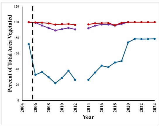 For all 20 images, the total area within each vegetation type in the scour was calculated based on the proportion of cells, or percentage of total area, that fell into each binary category: no vegetation or with water (NDVI ≤ 0.2) or with vegetation (NDVI > 0.2). While it was not possible to create a confusion matrix, which would determine accuracy of classification (correctly and incorrectly) into the two classes, due to the lack of ground truthing data at the same scale across all years, it was possible to use ground truthing to evaluate accuracy for the pattern of vegetation changes detected by the time-series analyses of remote sensing images. This is further emphasized by the attempt to use other binary and multilevel classifications, which generated inconsistent results that were difficult to interpret, with considerable variation across the images. While there were differences in image resolution, that did not seem to have an impact, as resolution differences were grouped into two time periods: the images from 2005 to 2008 were at the lower resolution of 30 m and those from 2010 to 2024 were at the higher resolution of 3 m or 5 m. The exception to this was the image from 2013 (30 m); however, this image was discarded because of overall poor quality.