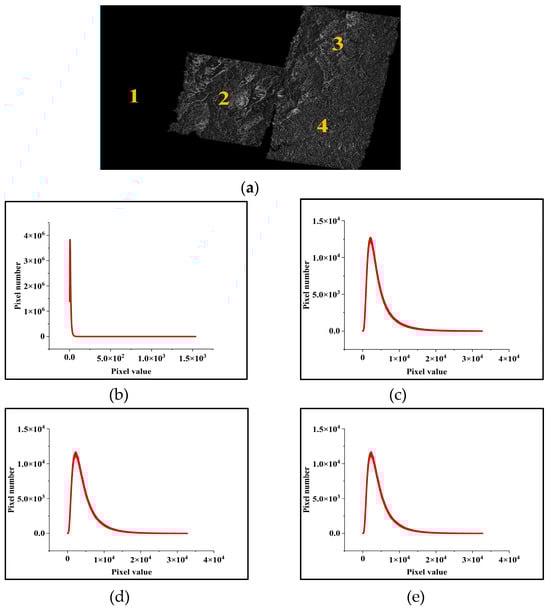 16-bit SAR intensity images and histogram. (a) Mosaic of images 1–4, (b) abnormal brightness image 1 histogram, (c–e) normal brightness images 2–4 histogram.
