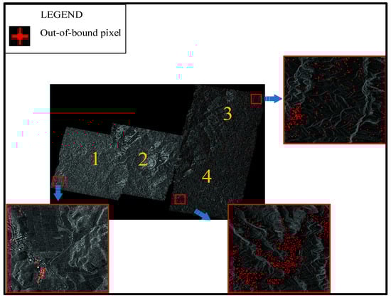 Seasonal variations, radar signal attenuation, and other factors can degrade the radiometric quality of images, leading to significant discrepancies in SAR images even after calibration [9,10]. As shown in Figure 1a, the brightness anomaly SAR intensity image is darker overall. As shown in Figure 1b, most grayscale values in the brightness anomaly image are relatively small, with a low gray mean and standard deviation of the image. Although the traditional color harmonization method can resolve color consistency issues in images with brightness anomalies, it may also lead to the loss of brightness information. For instance, the existing color harmonization method determines the stretch parameters of all images by solving a quadratic programming optimization problem [6], which can enhance the gray consistency of SAR intensity images. However, it may also result in grayscale values exceeding the quantization range after image stretching, as shown in the red markers in Figure 2. The pixel values exceeding the quantization range in the first, third, and fourth images were 559, 14,376, and 10,622, respectively. Typically, out-of-bounds pixel values are directly set to 0 or the maximum grayscale value, leading to the loss of brightness information.