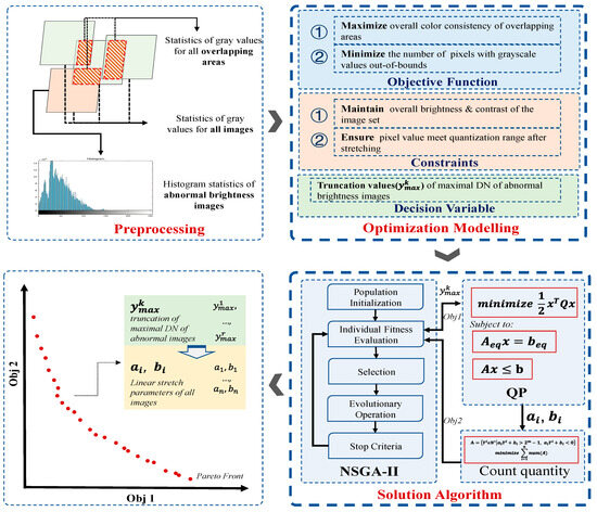 The overall workflow of the proposed method is illustrated in Figure 3, which comprises three main steps: (1) Data Preprocessing: To obtain the input parameters for the optimization model, the grayscale values of all images, the grayscale values in the overlapping regions of image pairs, and the histograms of the brightness anomaly images were collected. (2) Optimization Modeling: Maximizing the overall gray consistency of overlapping image pairs and minimizing brightness information loss were formulated as two objective functions. The maximum brightness truncation values of the anomalous images were selected as decision variables. The preservation of the overall brightness and contrast of the images before and after processing was considered as an equality constraint. The grayscale values of the images after stretching were kept within the quantization range as inequality constraints. This model formulated the specific problem of gray consistency as a mathematical problem. (3) Solution Algorithm: A hybrid solution framework integrating the NSGA-II [25,26] and QP [27] algorithms was developed to solve the complex optimization model. This framework enabled the simultaneous determination of truncation values for brightness anomaly images and linear stretch parameters for all images. Each solution in the final Pareto optimal front solution set represented a unique combination of stretch parameters for all images and corresponding truncation values for brightness anomaly images.