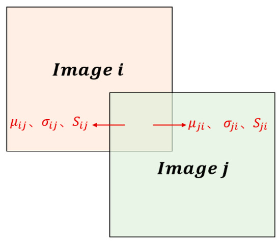 where and represent image pairs with overlapping regions; is the total number of images; and are the gray means in the overlapping part of the images and after stretching; and are the standard deviations in the overlapping part of the images and after stretching; and are the linear stretching parameters of image ; and are the linear stretching parameters of image ; is the gray mean of the overlapping region of the image before stretching; is the gray mean of the overlapping region of the image before stretching; is the standard deviation of the overlapping region of the image before stretching; is the standard deviation of the overlapping region of the image before stretching; is equal to , which denotes the number of pixels in the overlapping part of the images and . Figure 4 shows the overlapping image pairs.