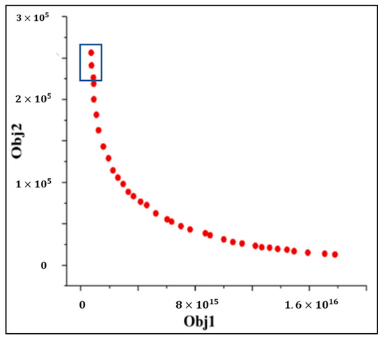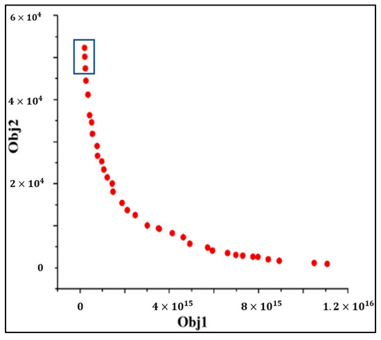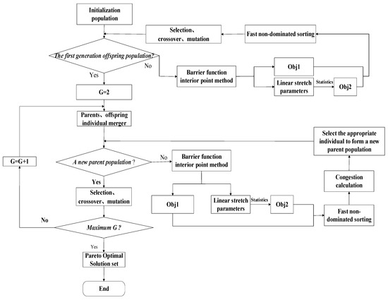 This study addresses a multi-objective optimization problem involving two types of objective functions. The first type is a continuous quadratic function, which, together with the constraints, constitutes the QP model. The second type is a discrete nonlinear statistical function. Based on these characteristics of the optimization model, we propose a solution algorithm. Based on the NSGA-II algorithm framework, a set of truncation values for the brightness anomaly images is generated. Once the truncation values are determined, the Obj 1 and linear constraints can be formulated as a QP model. The complexity of solving this model increases significantly with the number of decision variables. The barrier function interior-point method [28,29] offers global convergence and numerical stability, making it highly effective for handling large-scale and high-dimensional QP problems. The barrier function interior-point method solves for the linear stretch parameters and Obj 1 values. As the solution approaches the constraint boundaries, the barrier function value increases rapidly, maintaining the optimization process within a feasible region. The Obj 2 value is determined by statistics based on the linear stretch parameters. Pareto optimization [30] considers the combined effects of multiple objective functions. It can handle optimization problems with conflicting objectives by providing a set of solutions known as the Pareto front, which consists of numerous “non-dominated” solutions. The combination of metaheuristic and deterministic algorithms, through the iterative process of the NSGA-II algorithm, generates a set of Pareto optimal solutions, achieving the integrated solution of truncation values and stretching parameters.