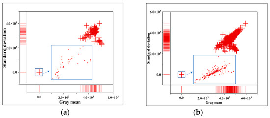 Image’s gray mean and standard deviation: (a) 122 images, (b) 737 images.