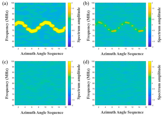 The simulation initializes 3D wind speeds across all range gates with vx = 12 m/s, vy = 12 m/s, and vz = 1.5 m/s, establishing a constant 45° horizontal wind direction throughout the simulation range. The scanning mode encompasses a full 360° azimuth range with 45° angular resolution, executed over two complete cycles. Through Equation (4), we determine the spectrum peak frequency for each azimuth position. Utilizing the system parameters detailed in Table 1, we generate spectrum data across 16 azimuth angles and 100 range gates.