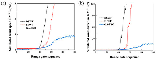 Simulated wind retrieval accuracy: (a) Horizontal wind speed RMSE; (b) Horizontal wind direction RMSE.