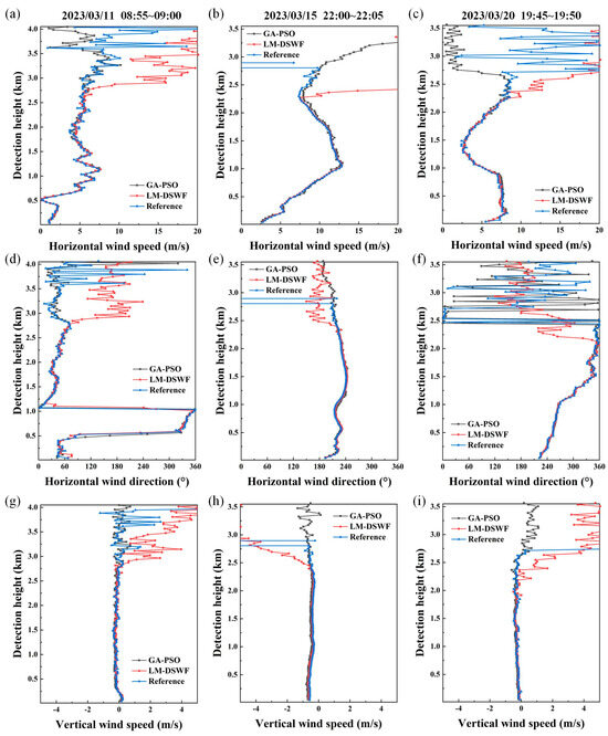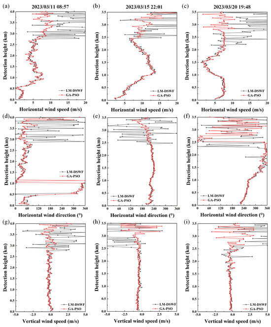 As shown in Figure 6, the comparative analysis reveals obvious performance characteristics between the two algorithms. The effective detection range is determined by examining the maximum distance where continuous, stable wind speed and direction distributions are maintained with sufficient SNR levels. Given the proposed algorithm’s enhanced capability in low-SNR conditions, the evaluation of effective range focuses on the distance over which stable wind speed and direction distributions are maintained with reliable data continuity. For the three datasets presented in Figure 6, the effective detection ranges achieved through the LM-DSWF algorithm are 2.82 km, 2.46 km, and 2.16 km, respectively. In comparison, the GA-PSO algorithm demonstrates superior performance with effective detection ranges of 3.78 km, 3.15 km, and 2.76 km, respectively. Within the lower detection height (<2 km), both LM-DSWF and GA-PSO algorithms demonstrate comparable horizontal wind speed and direction retrievals, showing consistent trends and similar values. However, in the 2 km~3 km detection height, the GA-PSO algorithm exhibits significantly improved performance, maintaining reliable retrievals where the LM-DSWF results become increasingly scattered.