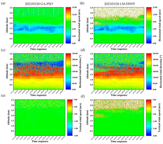 The analysis of Figure 11d,f demonstrates that the LM-DSWF algorithm produces erroneous wind retrievals during periods of low-SNR conditions, corresponding to Figure 11a. The GA-PSO algorithm maintains robust performance throughout. A representative case occurred at 11:20:04 when the LM-DSWF algorithm generated invalid wind profiles from 2.5 km to ground level. In contrast, the GA-PSO algorithm successfully reconstructs complete and physical wind profiles while maintaining temporal consistency and spatial continuity with adjacent measurements.