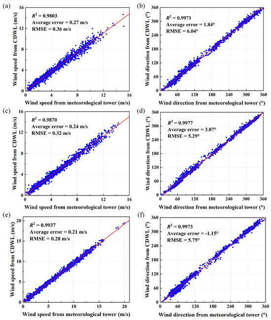 In order to ensure temporal alignment, both CDWL and tower measurements are averaged over 10 min intervals, which is commonly used in the CDWL validation [28,29,30]. The comparative analysis shows excellent agreement between the airborne CDWL measurements and meteorological tower reference data. Compared with the reference data from different altitude levels, the CDWL demonstrates mean wind speed and direction deviations better than 0.27 m/s and 3.07°, respectively, with corresponding RMSE better than 0.36 m/s and 6.04°. The linear analysis yields correlation coefficients R2 exceeding 0.9803 for wind speed and 0.9971 for wind direction between the airborne CDWL measurements and the reference data from the meteorological tower. The urban location of the meteorological tower introduces significant turbulence effects that influence CDWL measurement accuracy by inducing instantaneous flow disturbances and reducing heterodyne efficiency. These turbulent conditions increase wind retrieval error in the comparison experiments. Additionally, the GA-PSO algorithm’s computational efficiency prioritization involves trade-offs in wind speed estimation resolution, optimization cycles, and iteration requirements. While enabling real-time processing, this design approach may result in suboptimal solutions in some cases, representing another potential source of errors in wind retrieval.