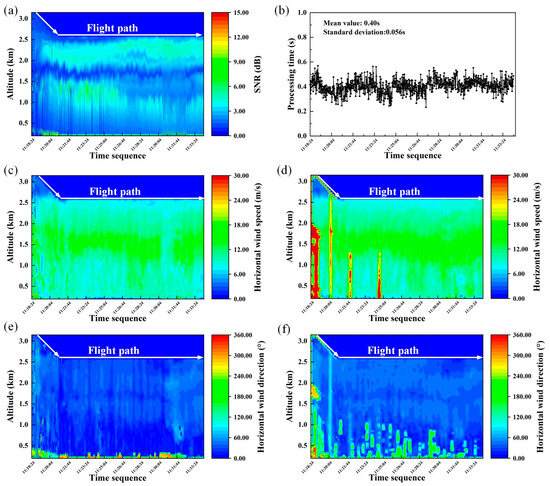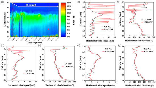 The LM-DSWF algorithm produces significant anomalies in retrieving horizontal wind speed and direction between 3.3 km~3.9 km and 4.2 km~5.3 km altitudes, as shown in Figure 10b,c. In contrast, the GA-PSO algorithm successfully obtains valid horizontal wind speed and direction measurements within the aforementioned 1.7 km range at the aircraft’s 5.5 km flight altitude. This represents a 31% improvement in recoverable wind information compared with the LM-DSWF method. To validate its accuracy, we analyze data at the dashed line 2, which exhibits temporal proximity to dashed line 1 with minimal wind variation and improved SNR conditions. Figure 10d,e demonstrates that the LM-DSWF algorithm achieves consistent wind retrievals in this scenario, showing good agreement with results from the GA-PSO algorithm. The wind field structure from dashed line 2 maintains temporal continuity with GA-PSO results from dashed line 1, confirming the proposed algorithm’s reliability in low-SNR conditions.