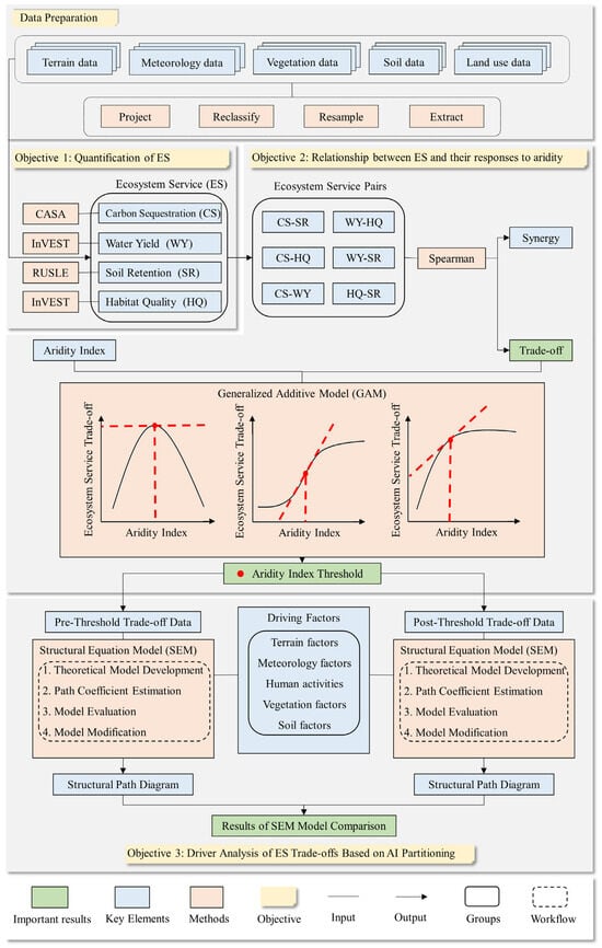 This study implemented a three-step process, as shown in Figure 2. First, CS, WY, HQ, and SR in NEC were quantified using the Carnegie–Ames–Stanford Approach (CASA) model, the annual water yield module of the Integrated Valuation of Ecosystem Services and Trade-Offs (InVEST) model, the habitat quality module of the InVEST model, and the Universal Soil Loss Equation (RUSLE), respectively (Objective 1). Second, the Spearman correlation coefficient was applied to clarify the relationships between ESs, and the GAM was employed to fit the response curves of ES trade-offs to the AI and identify the thresholds (Objective 2). Finally, based on threshold partitioning, SEM was conducted to analyze the drivers of ES trade-offs separately and to compare the differences in the driving pathways (Objective 3).
