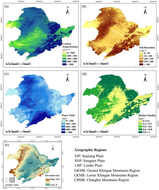 Spatial distribution of four ecosystem services in Northeast China (NEC): (a) carbon sequestration; (b) soil retention; (c) water yield; and (d) habitat quality. (e) Geographic regions of NEC.