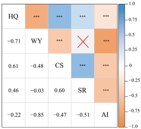 Relationships between aridity and ecosystem services. CS represents carbon sequestration; WY represents water yield; HQ represents habitat quality; SR represents soil retention; and AI represents aridity index. Note: *** indicates that the relationship between the two variables was significant at p < 0.001. Red “×” indicates a non-significant relationship between the two variables.