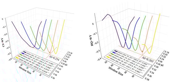 GAM curves were tested with varying window sizes ranging from 50 to 90 (Figure 5). Despite changes in window size, the response patterns of CS-WY and HQ-WY to the AI remained consistent. At a window size of 80, the CS-WY curve achieved the best fit (R2 = 0.974, AIC = −689.3) (Figure 5). Although the R2 for HQ-WY at a window size of 80 was slightly lower than that at size 90, its AIC was significantly smaller (R2 = 0.953, AIC = −679.9), indicating a better balance between the fit quality and model complexity. Thus, 80 was selected as the optimal window size for subsequent analysis.