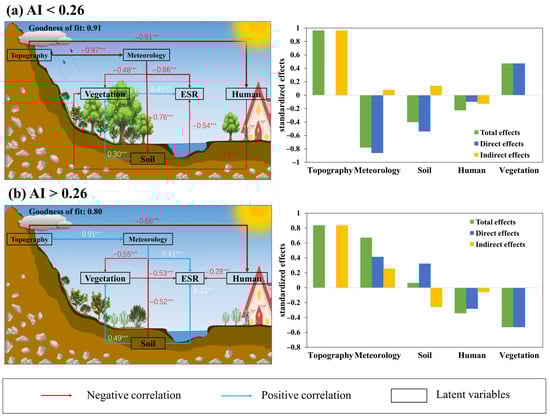 The driving pathways of ecosystem service (ES) trade-offs in regions with an (a) aridity index (AI) < 0.26 and (b) AI > 0.26. Note: driving factors include topography, meteorology, soil, human activities, and vegetation. Blue arrows represent significant positive correlations, while red arrows indicate significant negative correlations. The width of the arrows reflects the strength of the relationships. ESR represents relationships between ecosystem services. *** indicates significant relationships between two variables at p < 0.001. The bar charts on the right depict the standardized effects of driving factors on ES relationships.