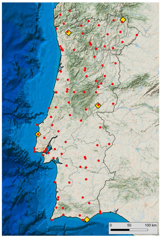 IPMA weather stations (solid red circles) and LS7002 sensors (yellow diamonds) locations.