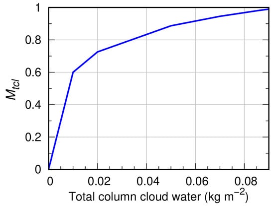 where Mtcl is the tcl membership function, which increases logarithmically with tcl and reaches a maximum value of 1 for tcl equal to 0.09 kg m−2, as shown in Figure 2.