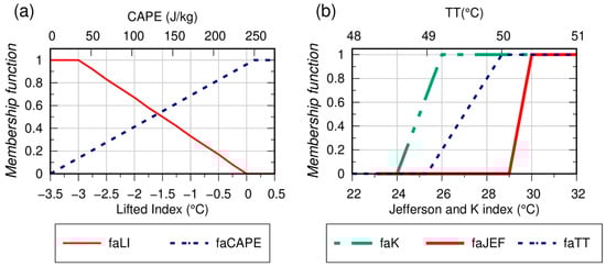 The shape of the membership functions faJEF, faK, faTT, faLI and faCAPE depend on the five stability indices defined in Table 1, according to the expressions presented in Table 2 and shown in Figure 3. Figure 3a shows that faLI increases linearly as the LIs decreases for values of the LIs between 0 and −3 °C. The CAPE membership function, faCAPE, increases linearly with CAPE up to 250 J kg−1 when it reaches the maximum value of 1 (Figure 3a). faJEF and faTT increase linearly with the JEF and TT indices, at the same rate, reaching a maximum value of 1 when the JEF and TT indices reach 30 °C and 50 °C, respectively, (Figure 3b). faK rises more rapidly with K values, for K index values between 24 and 26 °C (Figure 3b). The range of values used in Table 2 is based on previous studies [46].