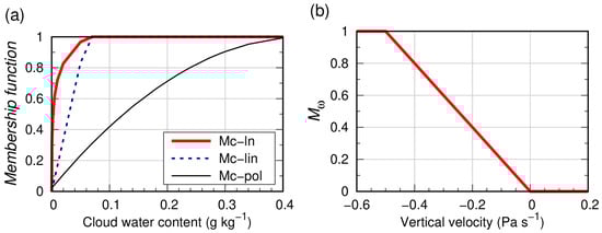 Membership functions of (a) cloud water content and (b) vertical velocity, used in Equations (1) and (6) to define IndexCON.