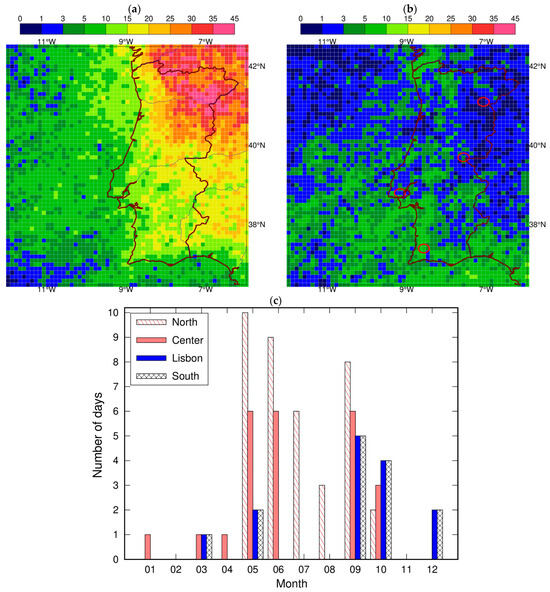 The geographical distribution of lightning for the period 2022 to 2023 is presented in Figure 5, revealing that lightning activity is more frequent in the warm season (May–October) than in the cold season (November–April), especially over land, in line with previous studies [27,28,30]. Figure 5 also shows that in the warm season, the maximum frequency of lightning occurs in the northeast region, characterized by a complex topography, where the maximum number of days with lightning varies between 35 and 45. This reflects the importance of orographic forcing in triggering deep convection, as discussed in previous studies [73]. In contrast, in the cold season, the maximum thunderstorm activity is observed in coastal areas and over the sea. The lightning seasonal cycle for four regions is illustrated in Figure 5c, showing that in the northeast and central regions of mainland Portugal, thunderstorm activity has a bimodal distribution with a maximum in late spring and early summer (May and June) and a secondary maximum in September and October. In the Lisbon area and the southern region, lightning activity is mainly concentrated in September and October.