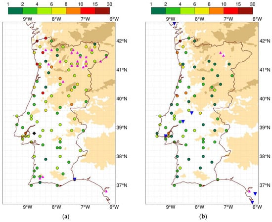 Figure 6 displays the spatial distribution of the days with a short-range heavy precipitation, hail and tornadoes reports. The threshold used to define an event of short-range heavy precipitation is 4 mm/10 min, which corresponds to 99th percentile of the 10 min precipitation for all stations (including only non-zero values) [74]. This figure reveals some similarities and some noteworthy differences between warm and cold seasons. For both seasons, heavy rainfall events were more frequent in the north of mainland Portugal, mainly near the coast. However, in the mountainous northeastern region, the frequency of heavy precipitation events is higher in the warm season than in the cold season. In the warm season, in this region, the maximum frequency of these events varies between 6 and 10 days. In addition, the hail reports were predominant in the mountainous region of northeastern Portugal, also in the warm season. In contrast, during the cold season, heavy precipitation events were concentrated mostly in northern coastal areas and the frequency of these events in the mountainous northeastern region was less than 4 days. In addition, tornadoes were more frequent in the cold season and at low altitudes, at a distance of less than 60 km from the coast. In the warm season, only one tornado was reported (see also Table 5). These results are in line with Leitão and Pinto [75], who showed that tornadoes in mainland Portugal occurred mainly from October to January, in association with cold fronts.