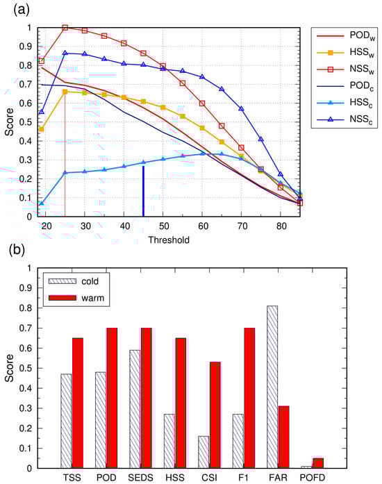 IndexCON skill scores for the warm and cold seasons. (a) The POD, HSS and NSS as function of the IndexCON thresholds, where the subscripts w and c refer to the warm and cold seasons, respectively. The thin and thick vertical lines indicate the optimal threshold () defined by Equation (8), respectively, for warm and cold season; (b) various skill scores for threshold .